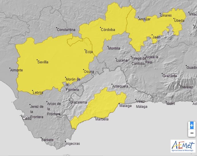 La aemet activa el aviso amarillo por altas temperaturas de 36 grados en Sol y Guadalhorce, y provincias de Sevilla, Córdoba y Jaén por 38 grados.