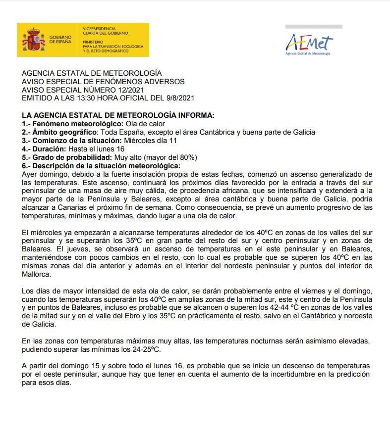 Buenas tardes, amigos de la meteo. Se confirma la primera ola de calor del verano 2021, pero antes de que muchos digan ” la primeraaaa” vuelvo a poner lo que dice la aemet sobre ola de calor.