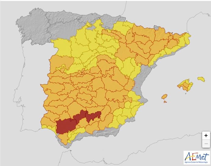 Destacar las provincias de Sevilla, Córdoba y Jaén en aviso rojo por temperaturas máximas de 44 grados.