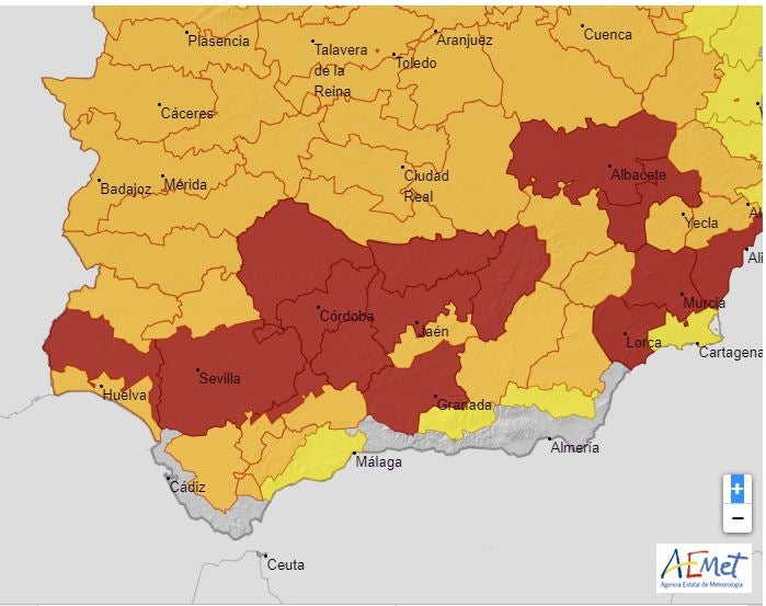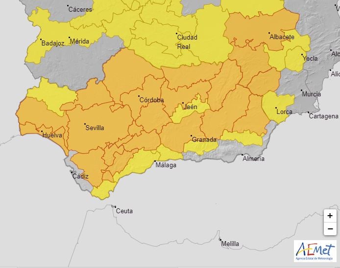 Las comarcas de Ronda y Antequera están en aviso naranja. La aemet comenta esto: Temperatura máxima: 43 ºC. En la comarca de Antequera, se pueden alcanzar puntualmente 44 grados.