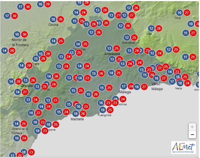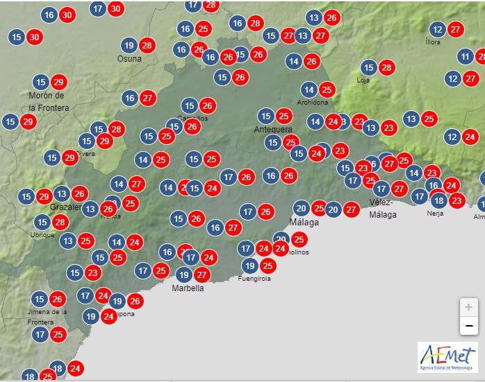 En cuanto a las temperaturas la AEMET prevé estas máximas y mínimas.