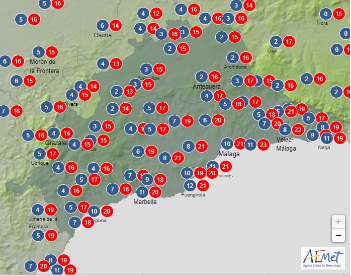 Buenas tardes, amigos de la meteo. Antes de daros la previsión del fin de semana en la provincia de Málaga, os paso las temperaturas mínimas que hemos tenido hoy y a continuación la efemérides del dúa 4 de noviembre.