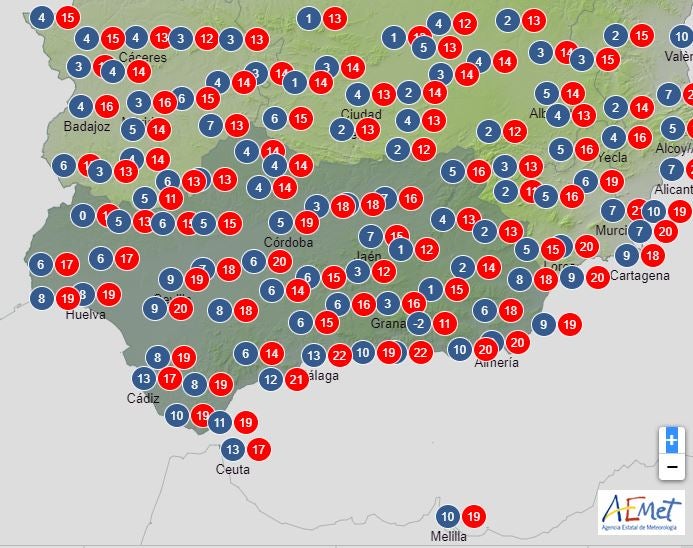 Os paso las temperaturas máximas y mínimas que prevé la Aemet para mañana lunes.