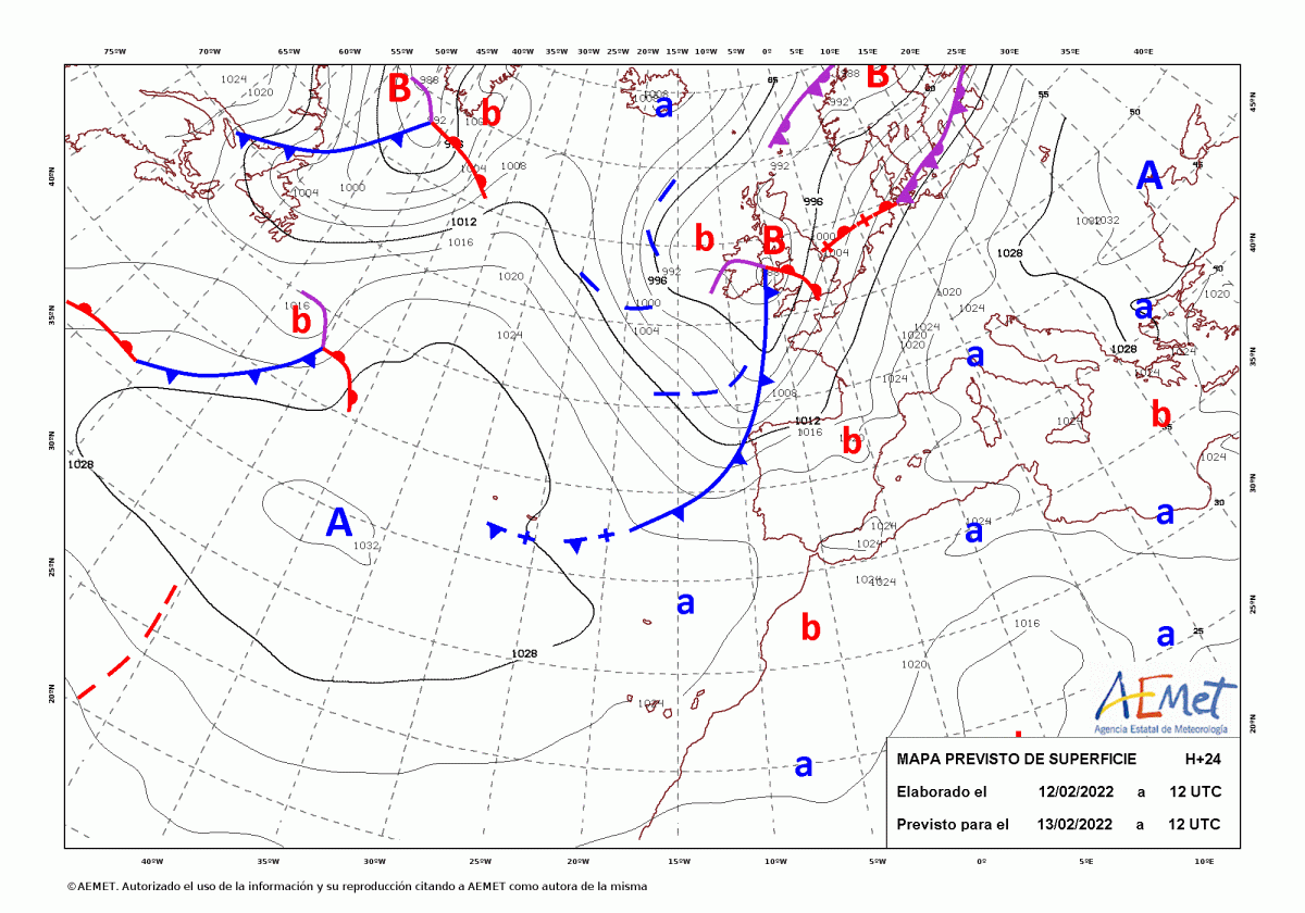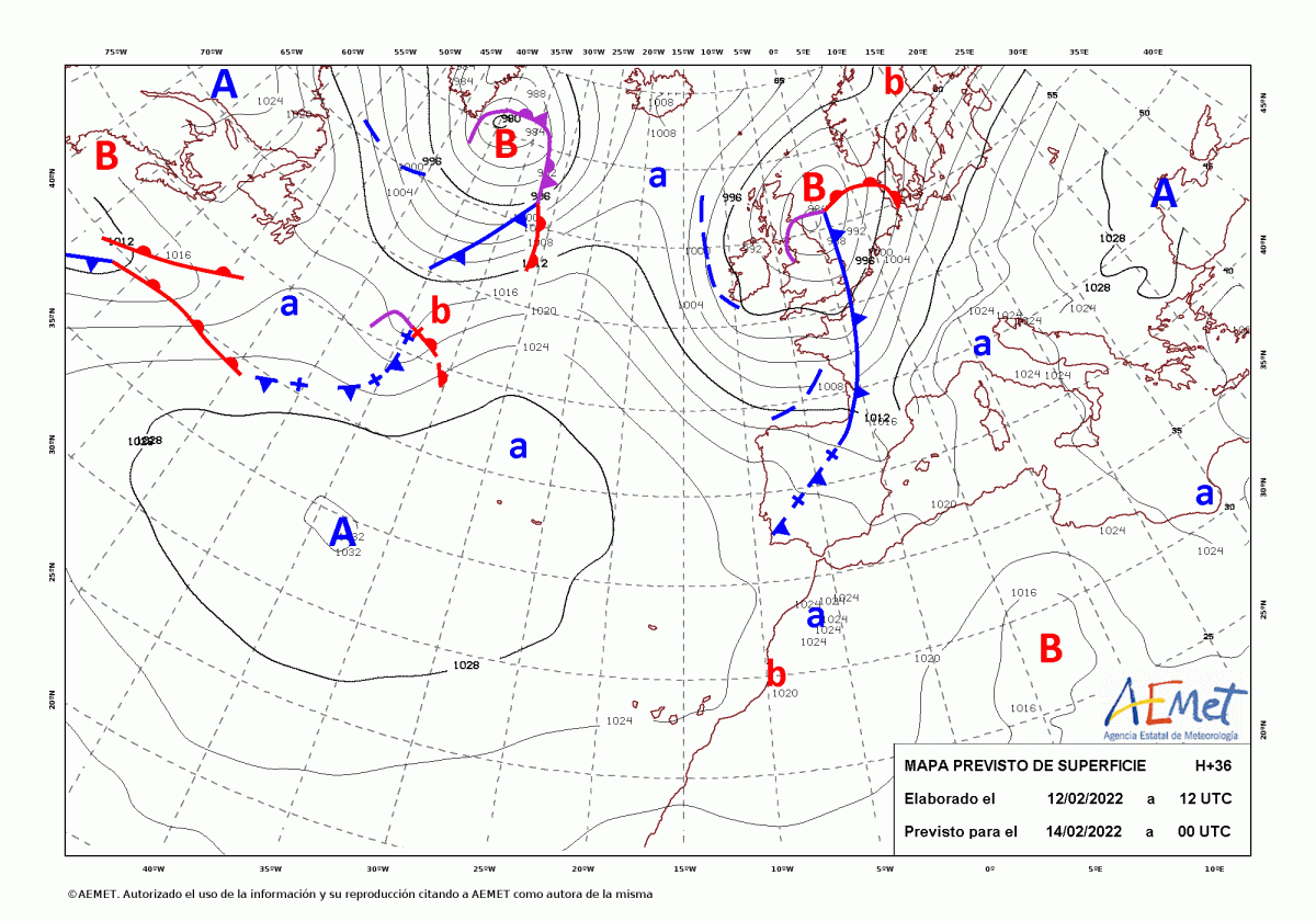Os paso el mapa de superficie elaborado por la Aemet previsto para el mediodía de hoy domingo y otro para la próxima madrugada del lunes. En el último mapa se ve que el frente ha perdido fuerza cuando llega al oeste de Andalucía.
