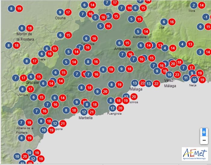 En cuanto a la previsión de la provincia de Málaga, lo más significativo será que se esperan rachas fuertes de viento de componente oeste a partir del mediodía. Estas rachas también tomarán protagonismo en todo el litoral mediterráneo andaluz y sierras orientales. En las zonas de la provincia de Málaga que el viento de componente oeste entre de tierra, subirán las temperaturas máximas, es decir, terral de invierno. Si hoy damos una máxima en la capital de 17 grados como ayer sábado, mañana podemos llegar a 20 grados o 21.