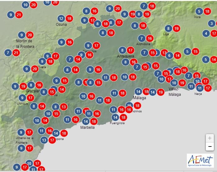 Os paso las temperaturas máximas y mímimas que prevé la Aemet.