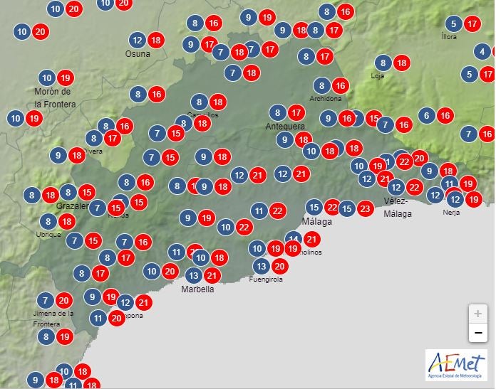 Muy buenos días, amigos de la meteo. Ayer miércoles el Rincón de la Victoria registro la temperatura máxima de España con 26.9 grados, seguida de Vélez Málaga con 26.3 y Algarrobo con 25.7. La máxima en la capital fue de 23.5 grados en el Aeropuerto, destacar también en esta estación una racha de 58 km/h. Fuente Aemet