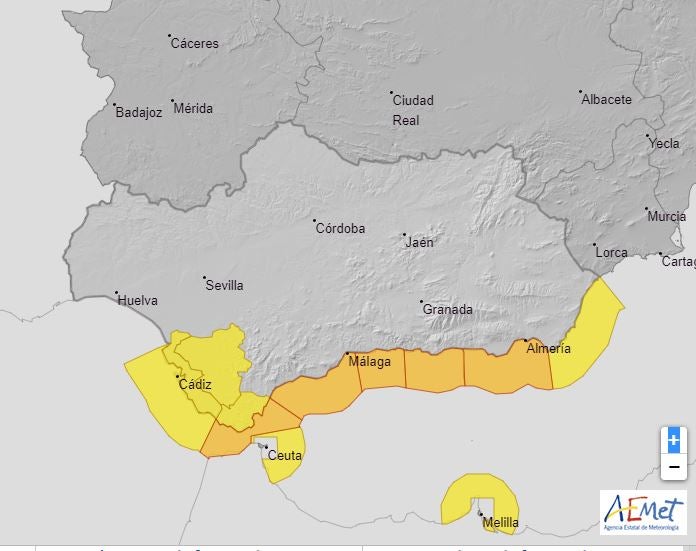 El sábado serán las costas de Málaga, Granada, Almería Estrecho las que entren en aviso naranja. Viento del este y nordeste con intervalos de fuerza 8 y olas de 4 m.