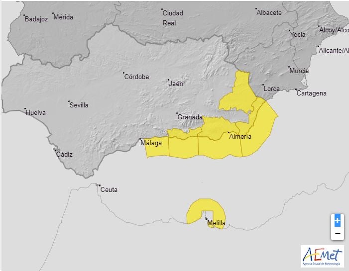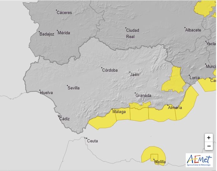 La aemet activa para mañana jueves a partir de las 15:00 horas avisos amarillos por fenómenos costeros en la costa de la Axarquía malagueña, Granada, Almería y Melilla. Viento del oeste con intervalos de fuerza 7.