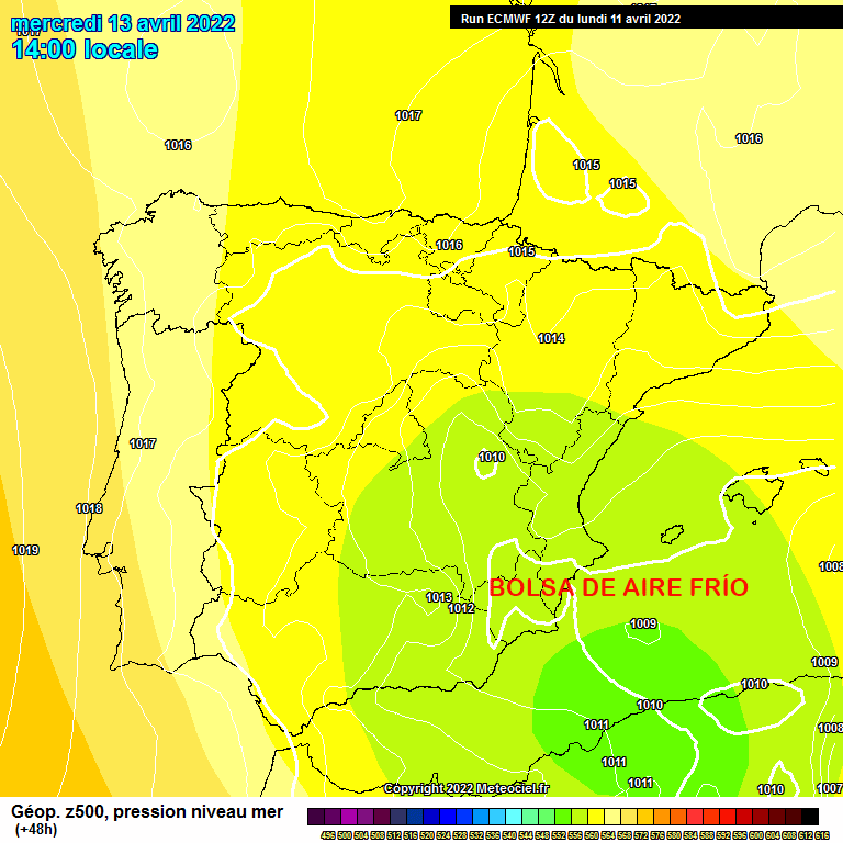 Mañana Miércoles Santo se formará una bolsa de aire frío, os paso el mapa para que veáis la posición que tendrá a primera horas de la tarde. Fuente meteociel, modelo europeo.