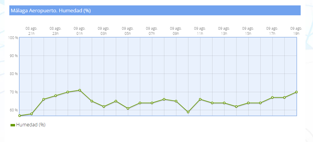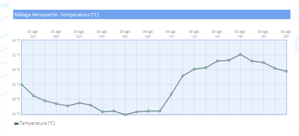 Ayer no hizo terral, pero debido a la humedad la sensación térmica de calor fue muy alta. A primeras horas de la tarde suele bajar la humedad, pero ayer rondamos el 66% e incluso sobre las siete de la tarde el 70%. La máxima se registro a las 16:10 minutos con 32.4 grados, la sensación térmica fue de entre 37 y 39 grados.