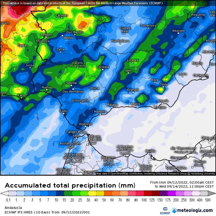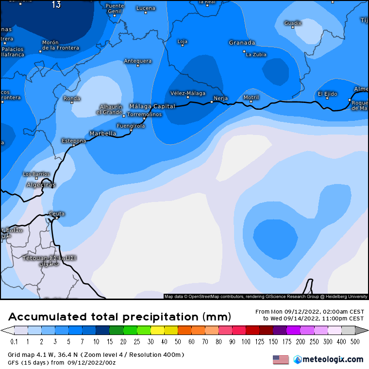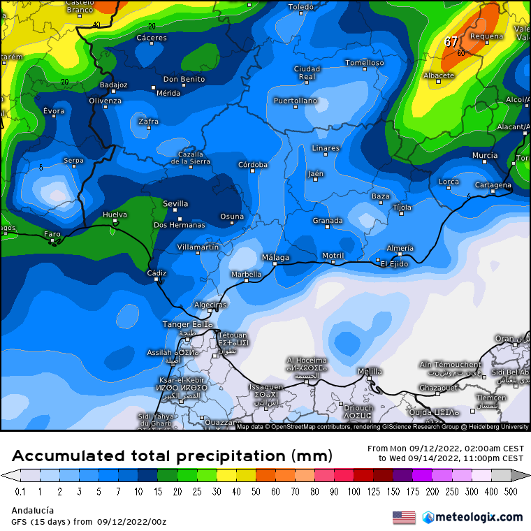 Si lo comparáis con el que os puse ayer, ha mejorado, sobre todo para la zona de la Axarquía malagueña, de cumplirse, podrían darse acumulados de 9 y 10 litros. No es mucho para la tierra pero lo agradecerá. En las demás zonas de la provincia malagueña entre 1 y 6 litros. Donde se espera más lluvia en la provincia de Huelva y Sevilla.