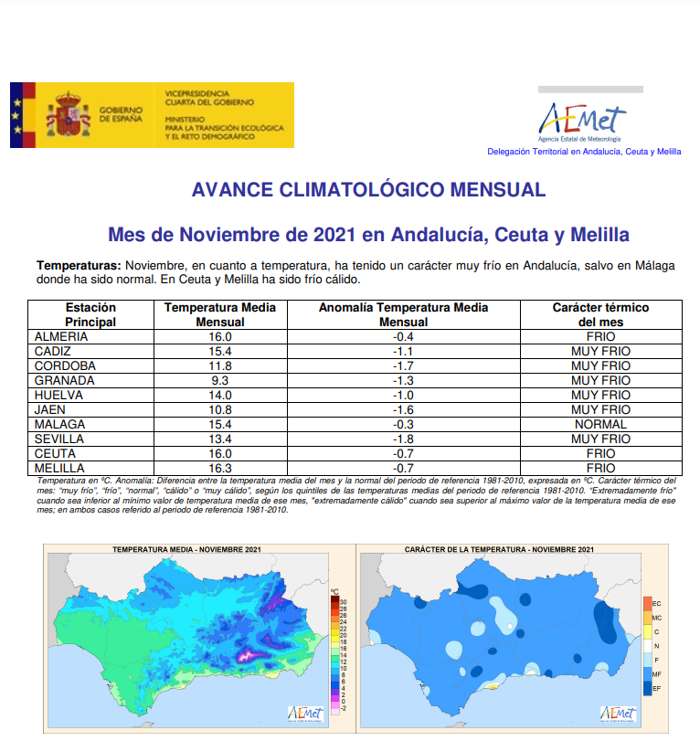 También comentaros que el mes de noviembre ha sido el más cálido desde que tiene registros el Aeropuerto de Málaga. La media en el aeropuerto ha sido de 18,0 grados, y el anterior fue en 2009, con 17,7. La media de las máximas también se ha batido con 22,9 grados, la anterior fue en 2009, con 22,4. Curiosamente el año pasado el mes de noviembre fue considero muy frío en Andalucía.