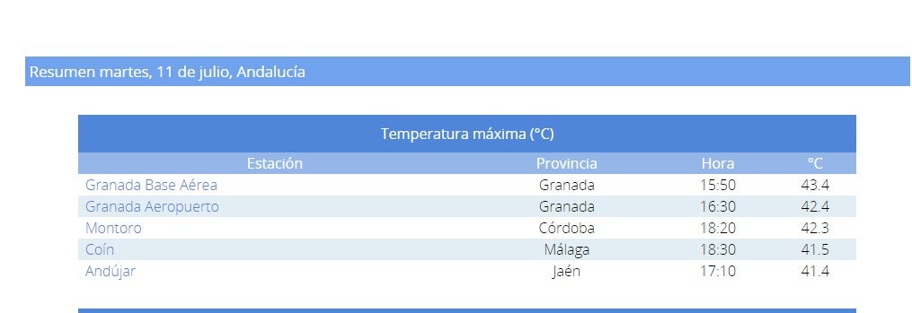 Temperaturas máximas que se dieron ayer en Andalucía y a continuación el mapa de avisos por altas temperaturas. Fuente aemet.