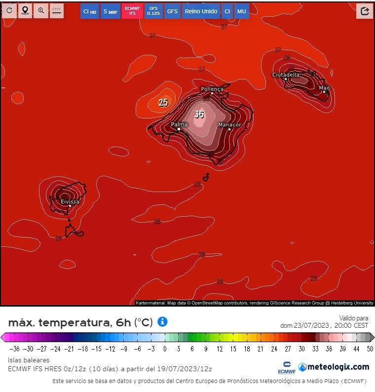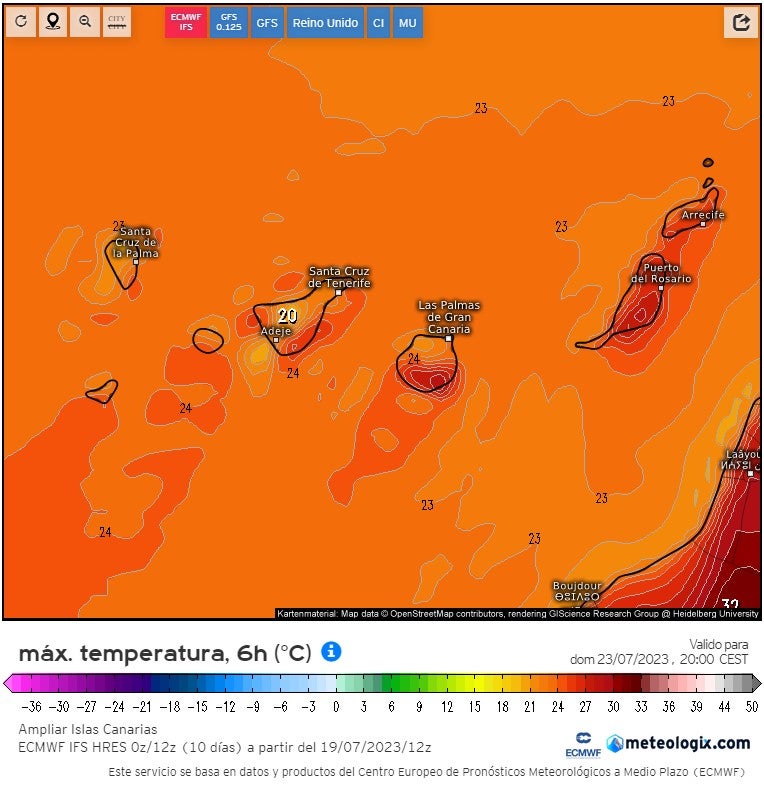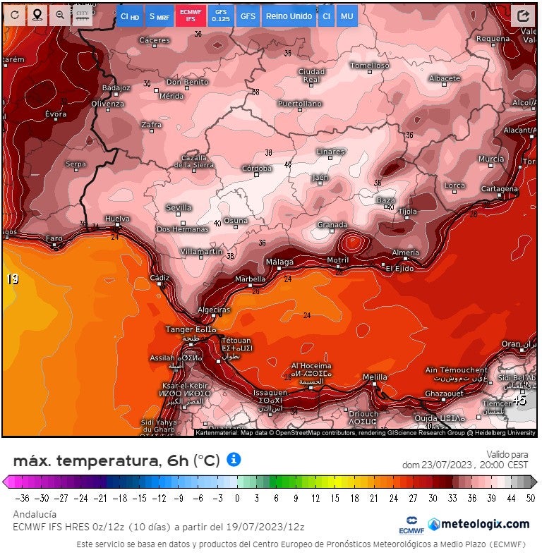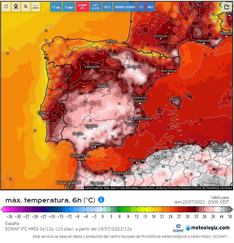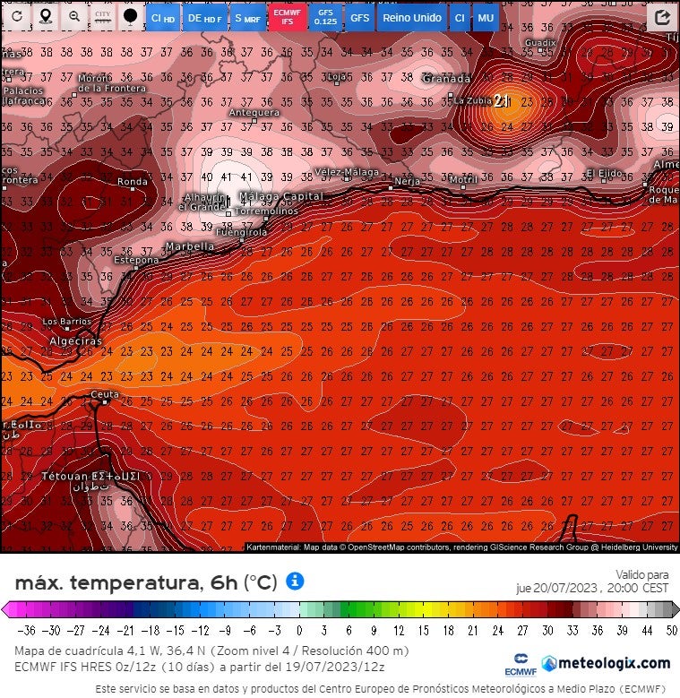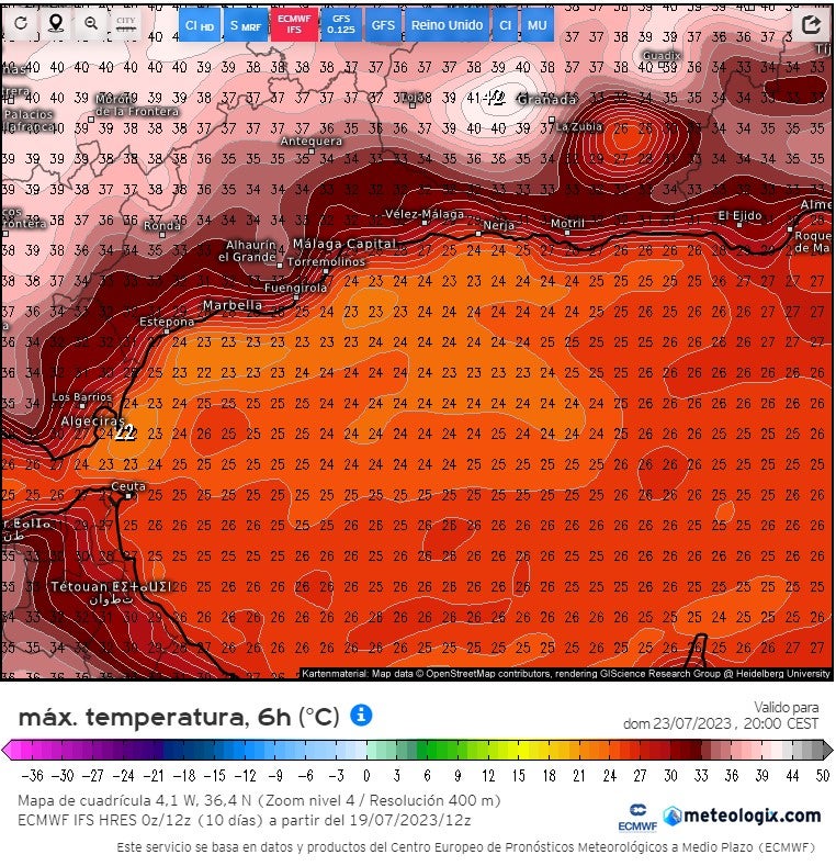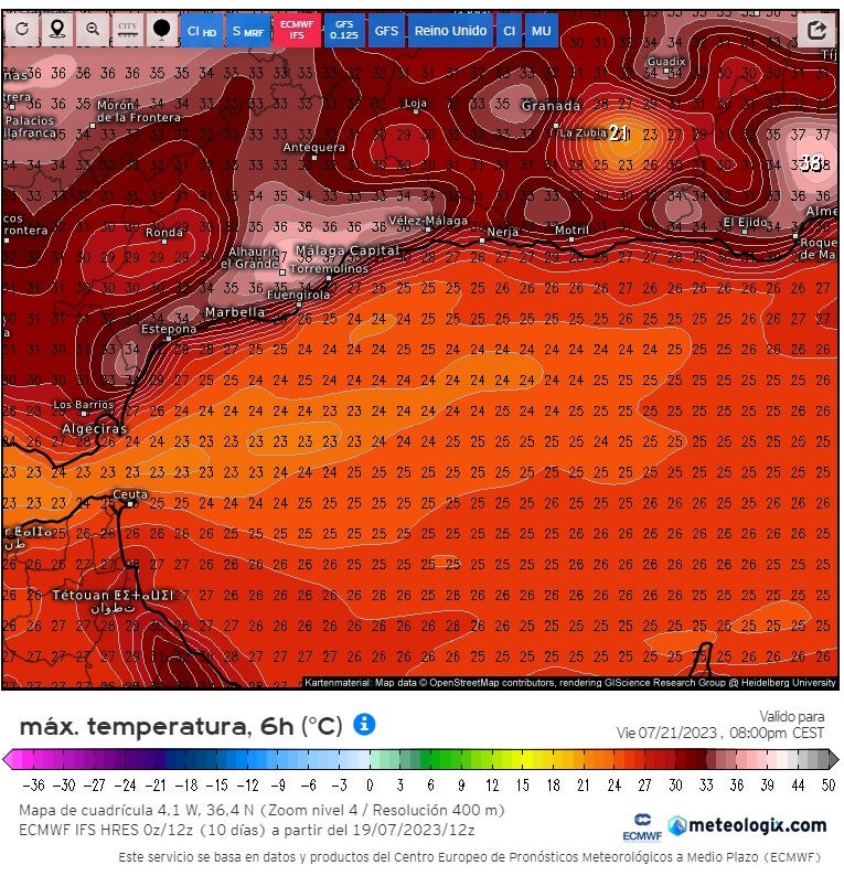 Os paso las temperaturas máximas que se prevén hoy jueves y mañana viernes. Fuente modelo europeo, meteologix