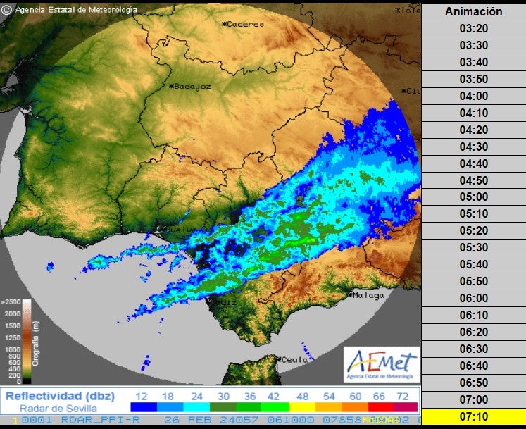 Buenos días, amigos de la meteo. Cuando son las siete y cuarto de la mañana en Málaga capital, el frente frío ya esta entrando en la provincia malagueña, como podéis ver en el radar de la aemet. Aunque venga del noroeste parece que se esta reactivando.