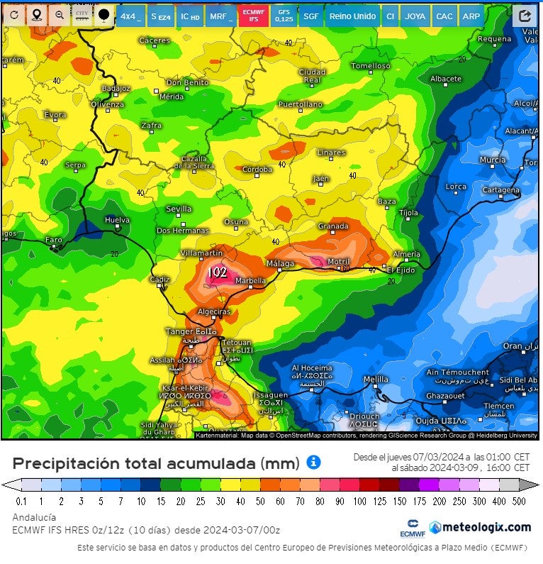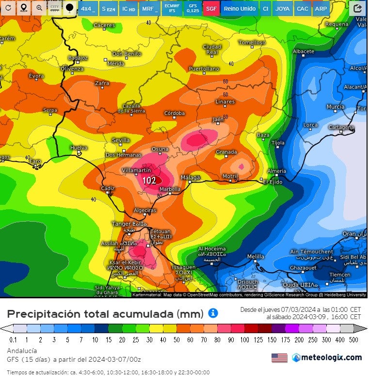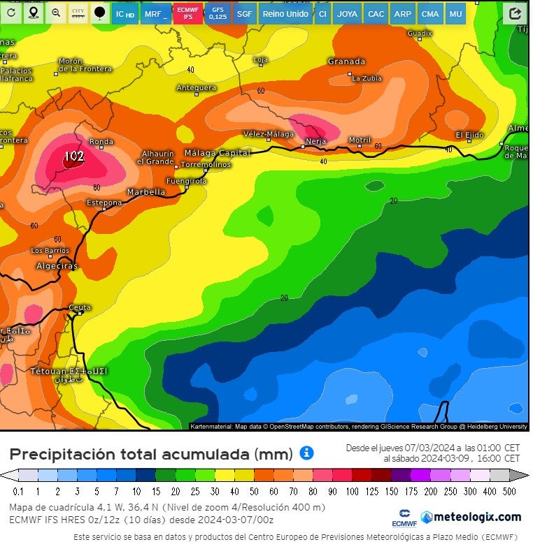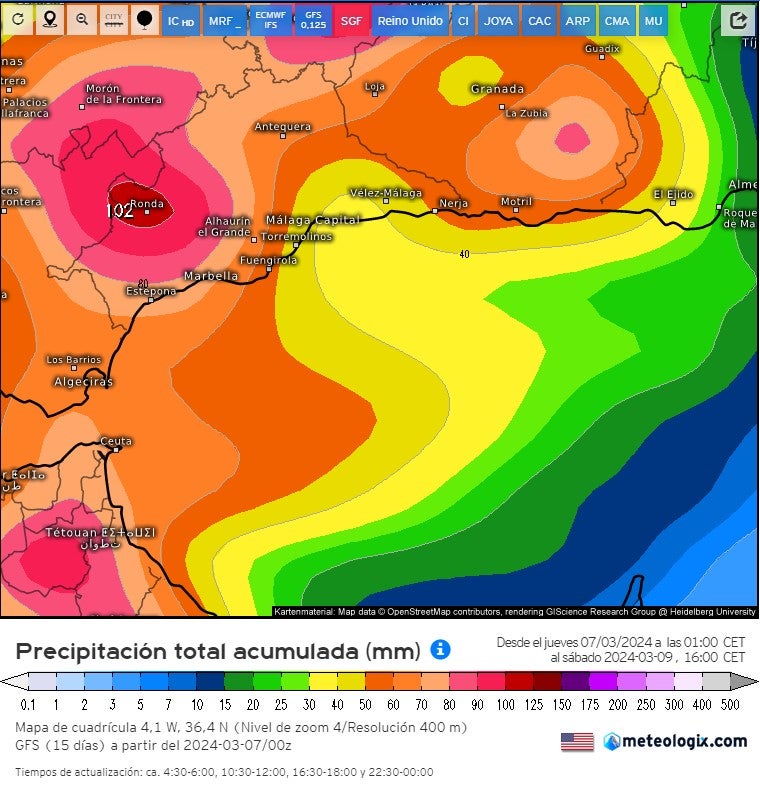 Os pongo los acumulados de los dos principales modelos de la provincia de Málaga y Andalucía. Desde hoy jueves, al sábado cuatro de la tarde. Fijaros que los dos coinciden.