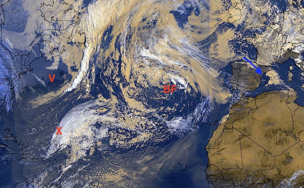 La vaguada V situada cerca de las costas norteamericanas tiende a desplazarse hacia el E/NE y profundizarse algo más. Por su interacción más o menos marcada con la circulación subtropical X es posible que se forme en esta última una pequeña vaguada, que en su movimiento hacia el E. podría captar algo del aire frío perteneciente a la circulación de la borrasca fría (BF). De este modo se acabaría conformando una débil dana muy cerca de la Península hacia el viernes. Ya ese día podrían darse algunos chubascos en el centro-sur de Portugal, Extremadura y puntos del Mediterráneo, que se extenderían en el fin de semana a zonas dispersas del sur peninsular y norte de Marruecos. Las cantidades de precipitación serían en principio poco importantes salvo en el caso de alguna tormenta aislada. A principios de la semana que viene es posible que la circulación de niveles altos se haga del N. girando al NE, y trayendo también en superficie un flujo de viento bastante frío para la época del año.