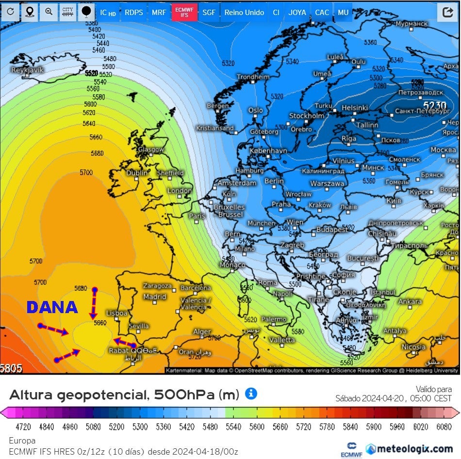 Os dejo con este mapa a 500 hpa, previsto para el sábado. Esa es la débil dana que nos afectará. Pero como muchos sabéis, las danas son impredecibles; lo mismo cae mucho o al final nada.