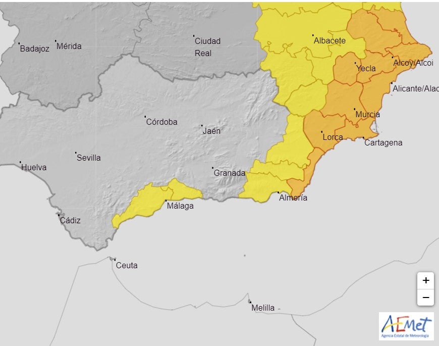 Os paso el mapa de avisos de la AEMET para Andalucía.