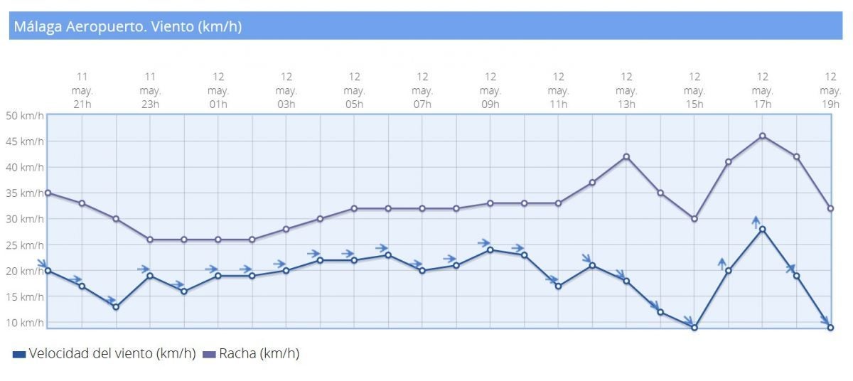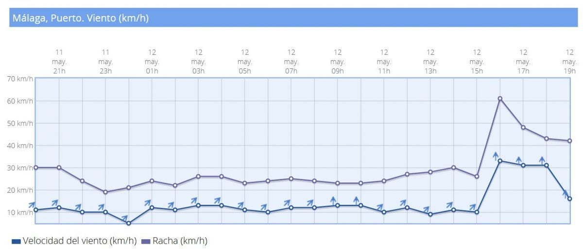 Muchos amigos que estaban por la zona del puerto, Malagueta y Pedregalejo me han mandado mensajes comentándome las rachas de viento fuerte del sur que han entrado de pronto sobre las cuatro de la tarde.  La estación de la Aemet del Puerto ha registrado una racha de 61 km/h. Tiene toda la pinta de una minigalerna, pero no lo tengo claro. Después ha seguido soplando terral.