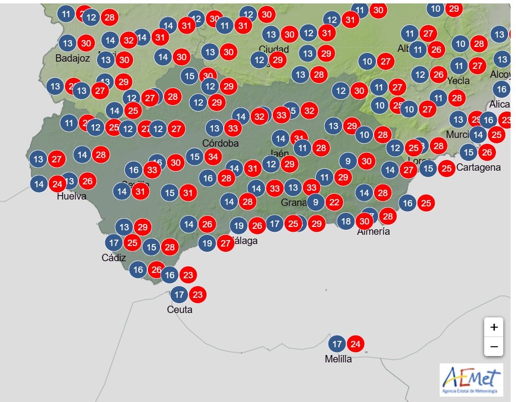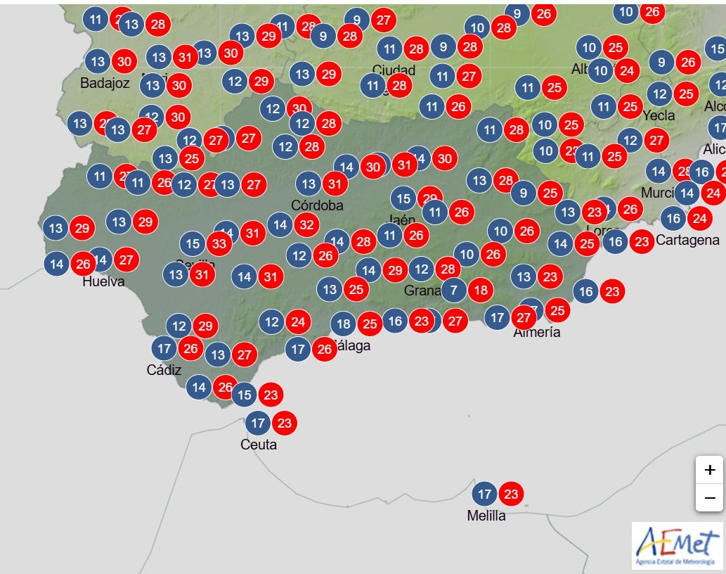 Temperaturas previstas por la AEMET para el sábado y domingo en Andalucía. En el Valle del Guadalquivir sobrepasarán los 30 ºC y 32 ºC.