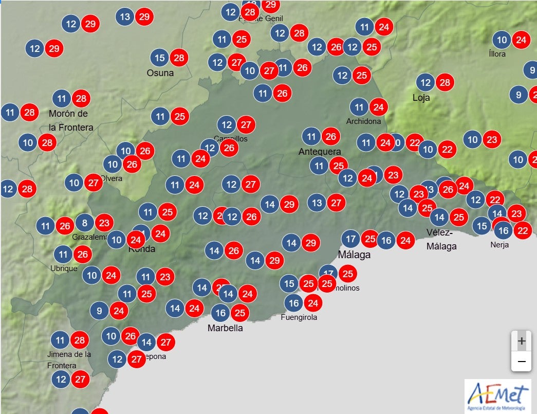 Mañana viernes subirán las temperaturas máximas y mínimas en toda la provincia, la probabilidad de precipitaciones es del 0%. Os pongo las temperaturas máximas y mínimas que prevé la Aemet.