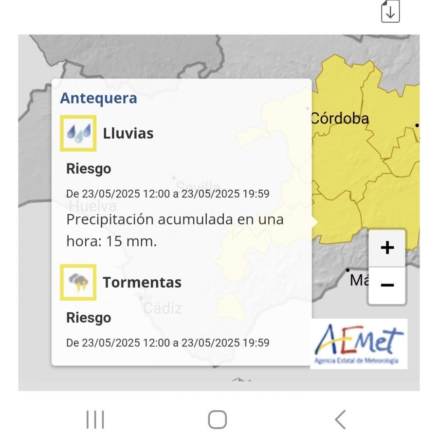 Buenas tardes, amigos de la meteo. La aemet activa el aviso amarillo por lluvias de 15 mm en una hora y tormentas en la comarca de Antequera.