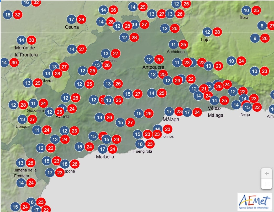 Os pongo las temperaturas máximas y mínimas que prevé la AEMET.
