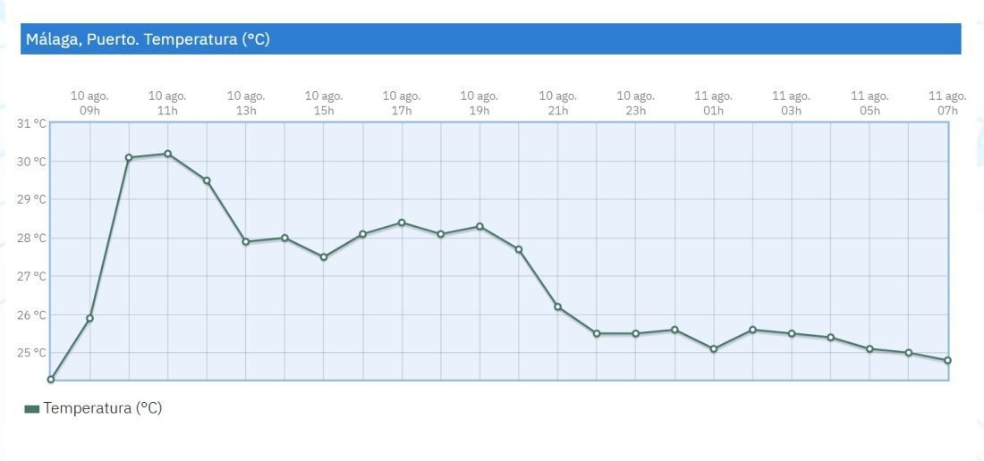 Buenos días, amigos de la meteo. La estación de la Aemet del Puerto de Málaga no ha bajado esta pasada madrugada de los 25 ºC, como en otras zonas de la capital cercanas al mar, como es el caso de mi estación en Avda. Ortega y Gasset. Es decir, hemos tenido una noche y madrugada tórrida. En las estaciones del Aeropuerto y Centro Meteorológico han rondado los 24,4 ºC; ha sido tropical. La temperatura del agua del mar rondará hoy los 27 ºC.