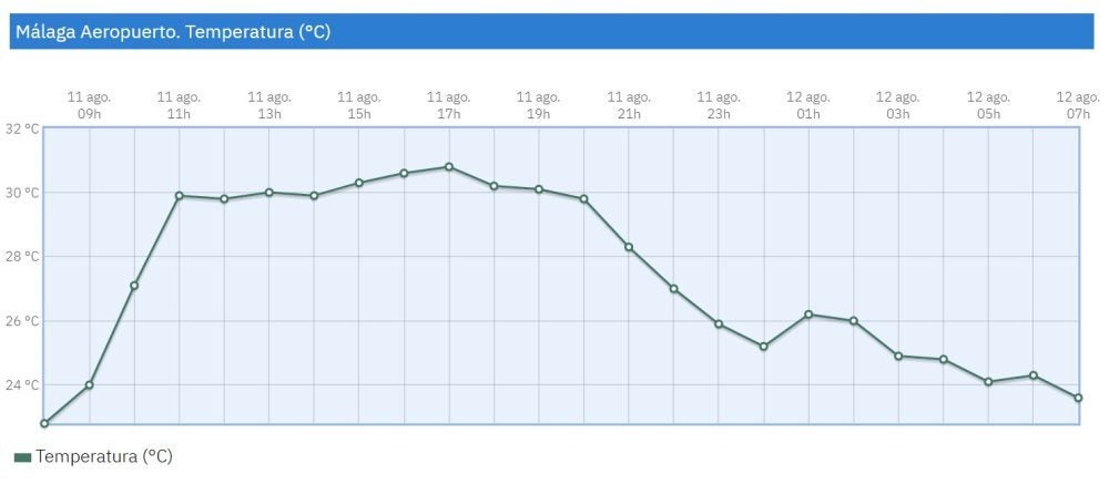 Buenos días, amigos de la meteo. Nuevamente noche y madrugada tórrida en muchas zonas de la capital malagueña; en la estación de la Aemet del Puerto no ha bajado de 25 ºC. Destacar que ha tenido un pico de 28 ºC, como podréis ver en el gráfico que os pongo a continuación. En las otras dos estaciones de la Aemet de Málaga capital, han rondado entre 25 ºC y 24 ºC. La temperatura del agua del mar en estos momentos es de 26 ºC; hoy puede llegar a 27 ºC.