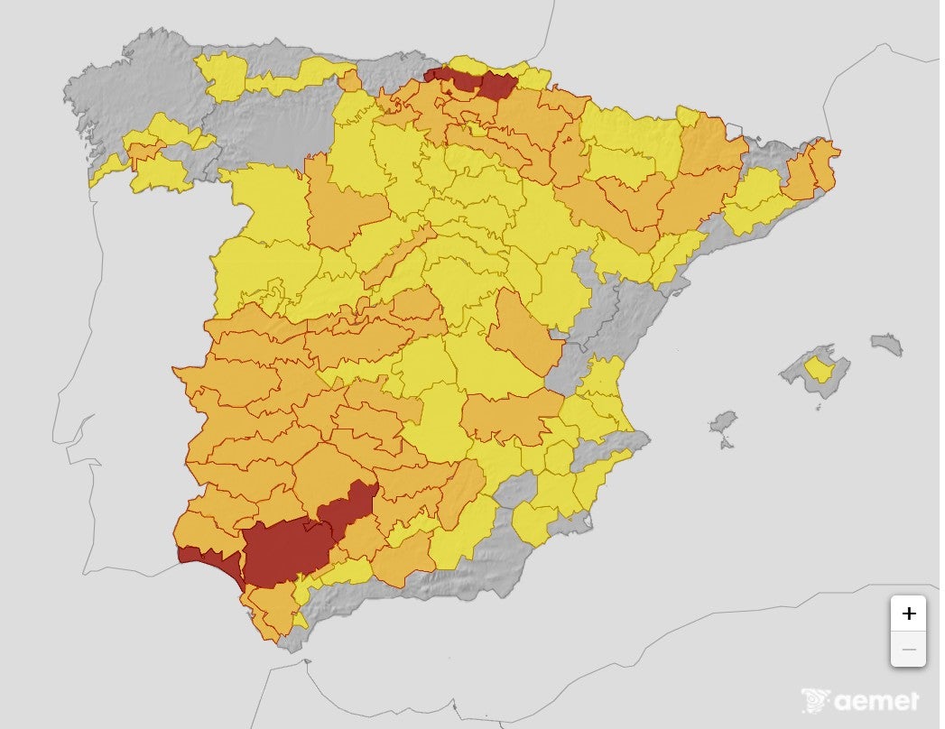 Os paso el mapa de avisos por altas temperaturas de hoy martes. Fuente: Aemet.