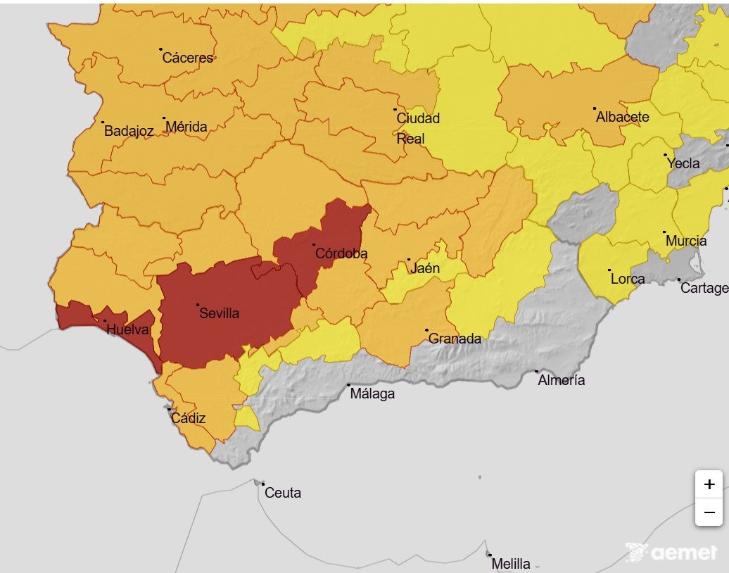 En la provincia de Sevilla, el aviso rojo será por temperaturas máximas de 44 ºC en la campiña; en las demás zonas de la provincia, naranja por temperaturas de 40 ºC.