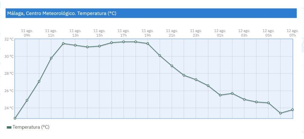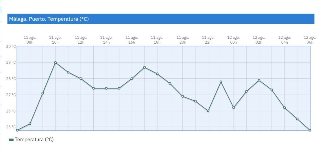 Buenos días, amigos de la meteo. Nuevamente noche y madrugada tórrida en muchas zonas de la capital malagueña; en la estación de la Aemet del Puerto no ha bajado de 25 ºC. Destacar que ha tenido un pico de 28 ºC, como podréis ver en el gráfico que os pongo a continuación. En las otras dos estaciones de la Aemet de Málaga capital, han rondado entre 25 ºC y 24 ºC. La temperatura del agua del mar en estos momentos es de 26 ºC; hoy puede llegar a 27 ºC.