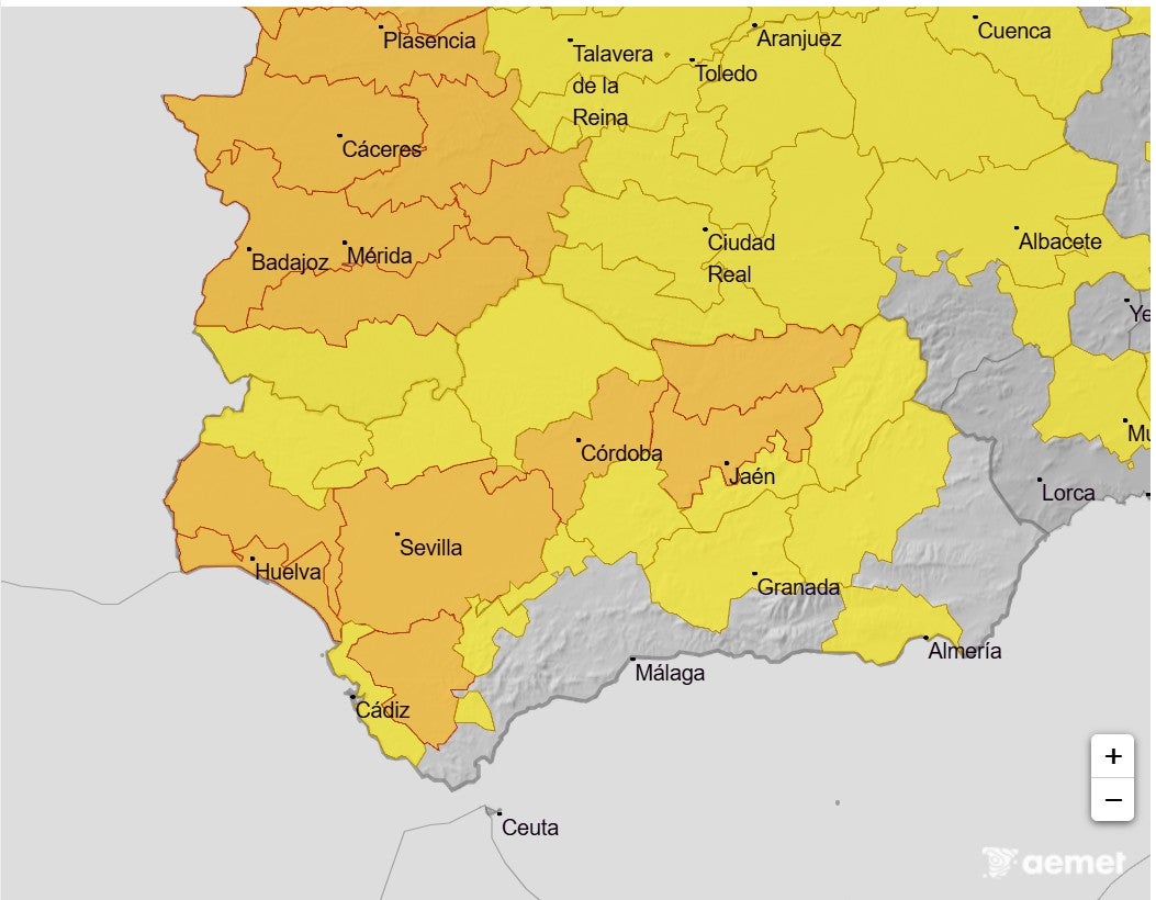 Hoy 13 de agosto, de las ocho provincias andaluzas, solo la de Málaga no tiene avisos por altas temperaturas. Os paso el mapa de avisos elaborado por la Aemet.