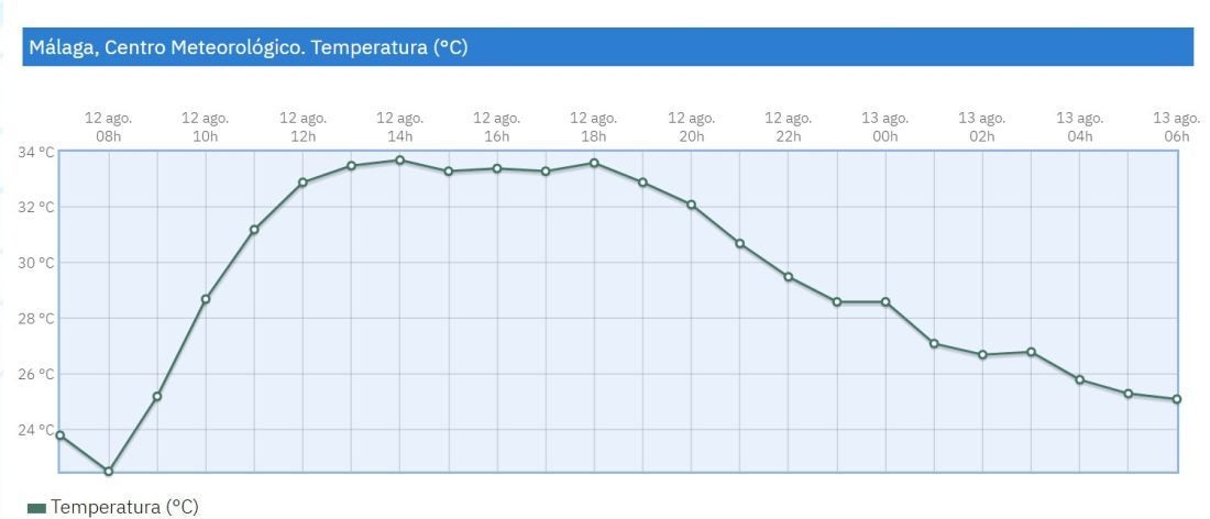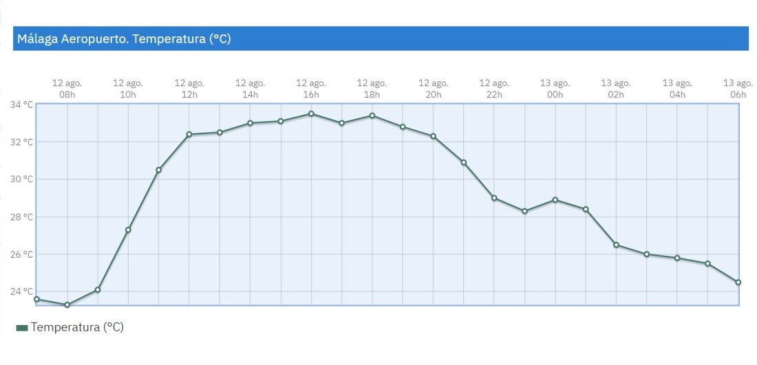 Desde que comenzó la ola de calor el día 3 de agosto, ayer se registró la temperatura más alta en la capital en el Centro Meteorológico con 34,1 ºC, seguida del Aeropuerto con 33,9 ºC y Puerto con 32,3 ºC. En el interior de la provincia malagueña, destacar Alpandeire con 38 ºC, Cortes de la Frontera 38,7 ºC, Álora 38,5 ºC, Ronda 37,9 ºC, Antequera 37,3 ºC y Fuente de Piedra con 39,2.