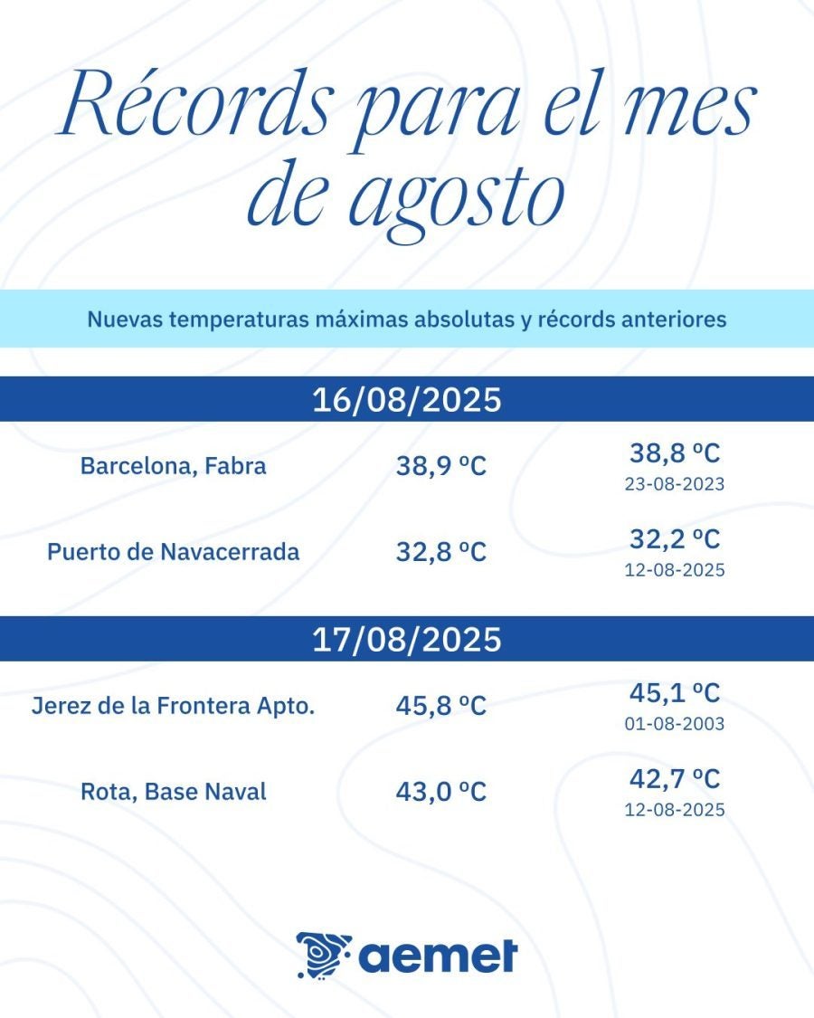 Buenos días, amigos de la meteo. El 3 de agosto comenzó la segunda ola de calor del verano 2025 en España y terminó ayer 18 de agosto, en total 16 días. He ido recogiendo datos de temperaturas máximas y mínimas de las estaciones de la Aemet del aeropuerto y puerto. Lo de poner oasis es comparando con zonas de Andalucía y otras regiones de España que se han visto afectadas por la ola de calor.
