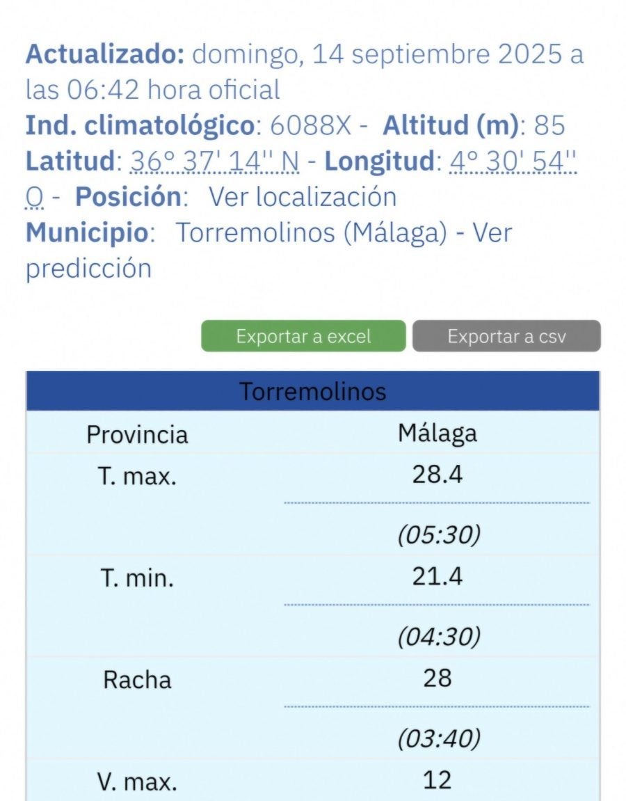 Fijaros en Mijas Pueblo, seguro que mi amigo Cristóbal Gambero lo comentará luego en Facebook. Destacar Torremolinos, que a las 4:30 de la madrugada registraba 21,4 ºC y a las 5:30 28,4 ºC.