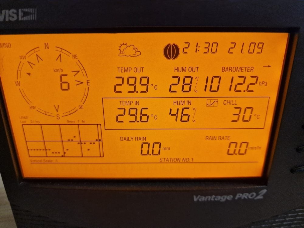 Ayer domingo a las 21:30 de la noche mi estación meteorológica en Avda. Ortega y Gasset registraba 29,9 °C, hoy que comienza el otoño astronómico a las 20:19 podemos llegar a una máxima de 30 ºC y 31 ºC en Málaga capital.