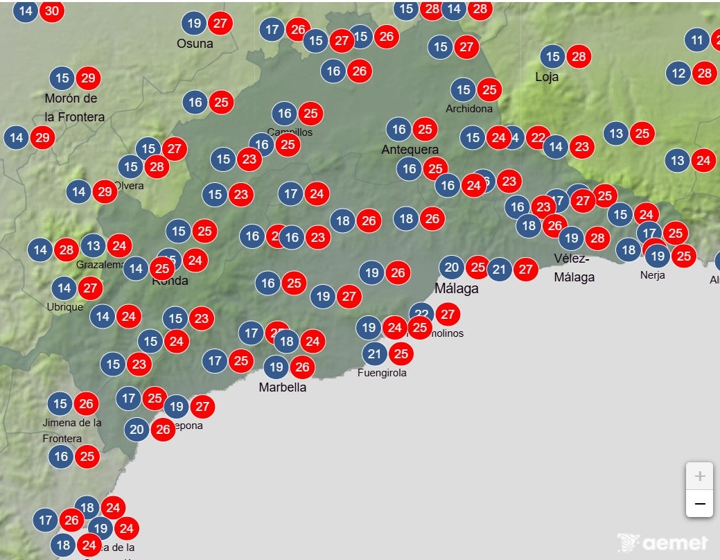 Os paso las temperaturas máximas y mínimas que prevé la Aemet. En la capital malagueña rondara entre los 24 ºC y 26 ºC, según zonas.