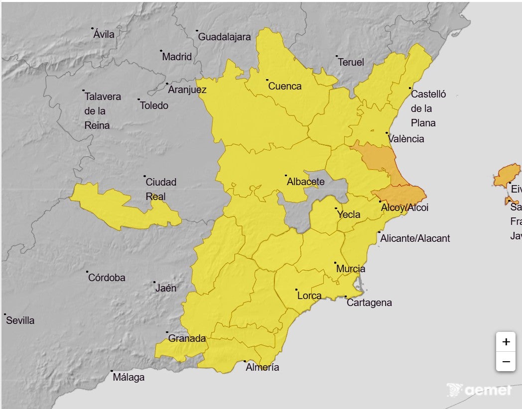 Buenas tardes, amigos de la meteo. La Aemet activa el aviso amarillo el jueves por lluvias y tormentas en las provincias de Jaén, Almería y Granada; en esta última, el aviso es para Sierra Nevada y Alpujarras. En la zona más oriental de la provincia de Málaga hay probabilidad baja de algunos chubascos. En la Comunidad Valenciana el aviso es naranja, precipitación acumulada en una hora: 40 mm. En 12 horas 100 mm