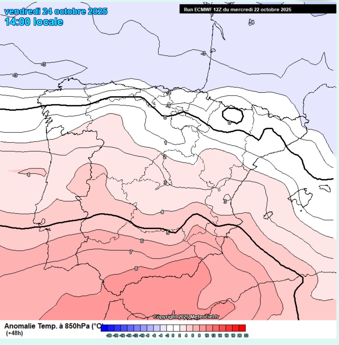 Mapa de anomalías positivas a 850 hpa (1500 m)
