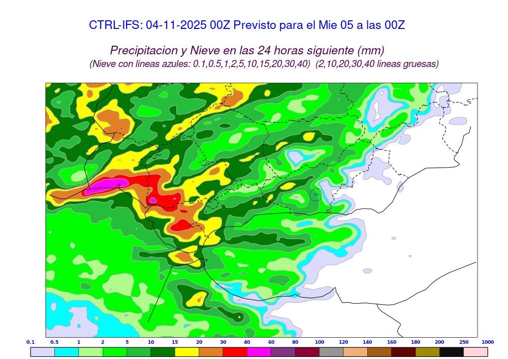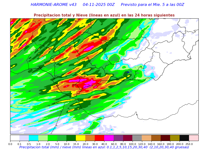 Algunas diferencias entre las precipitaciones previstas para mañana miércoles por IFS-CTRL y Harmonie-Arome, fuente Aemet.