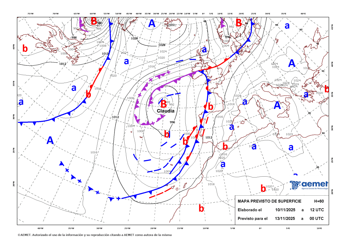 Antes de comentaros cuándo se esperan las primeras precipitaciones del frente frío generado por la borrasca Claudia, os pongo esta bonita imagen de masas de aire y el mapa de superficie previsto para mañana por la tarde.