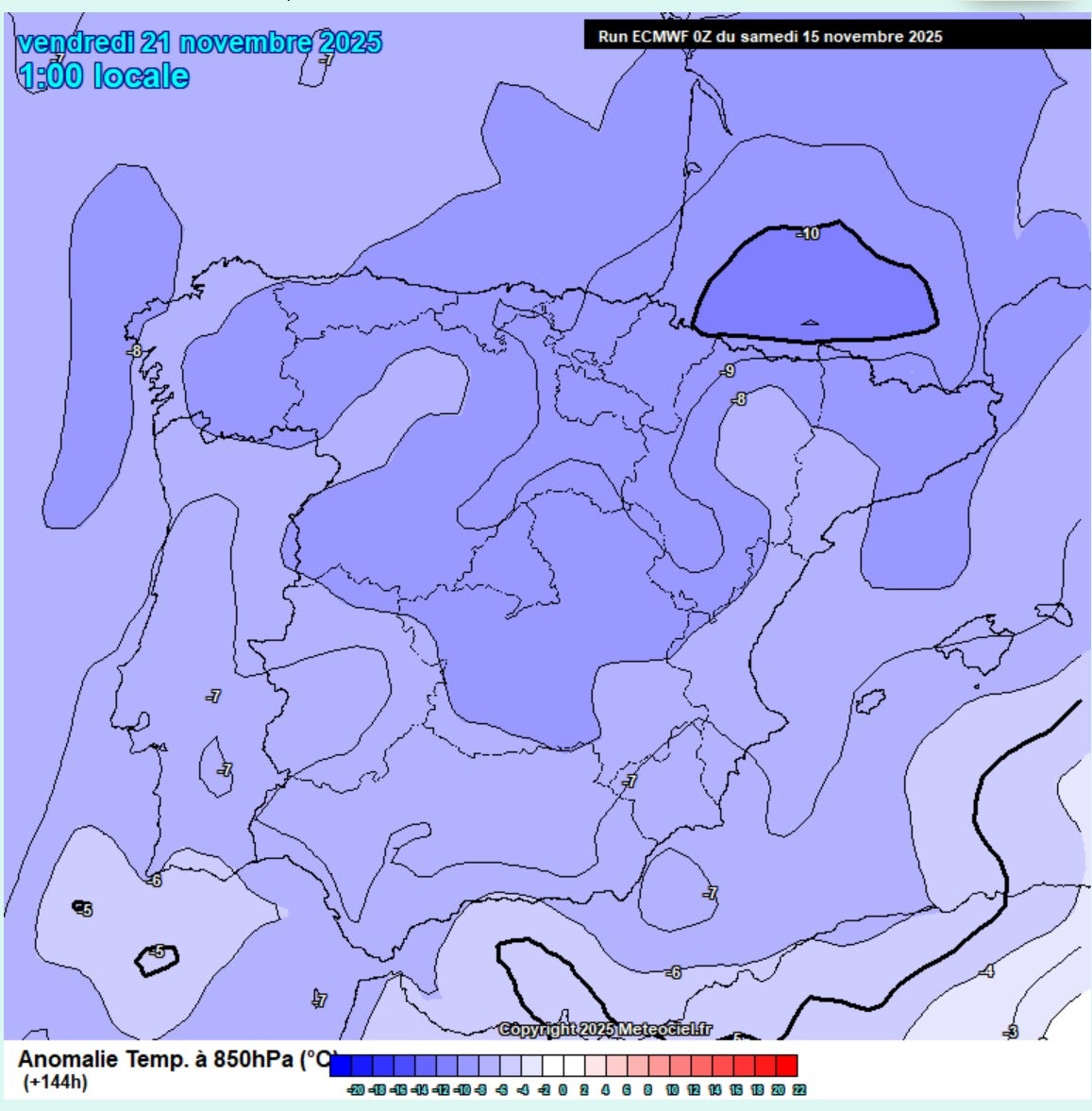 Una masa de aire frío de origen ártico empezará a afectarnos; las anomalías de temperatura a 850 hPa (1500 metros) serán negativas, como podéis ver en este mapa del modelo europeo a 850 hPa.
