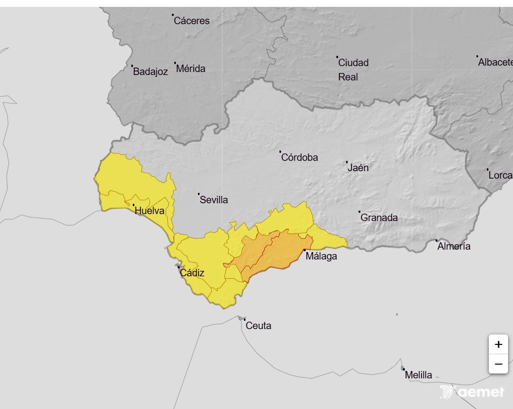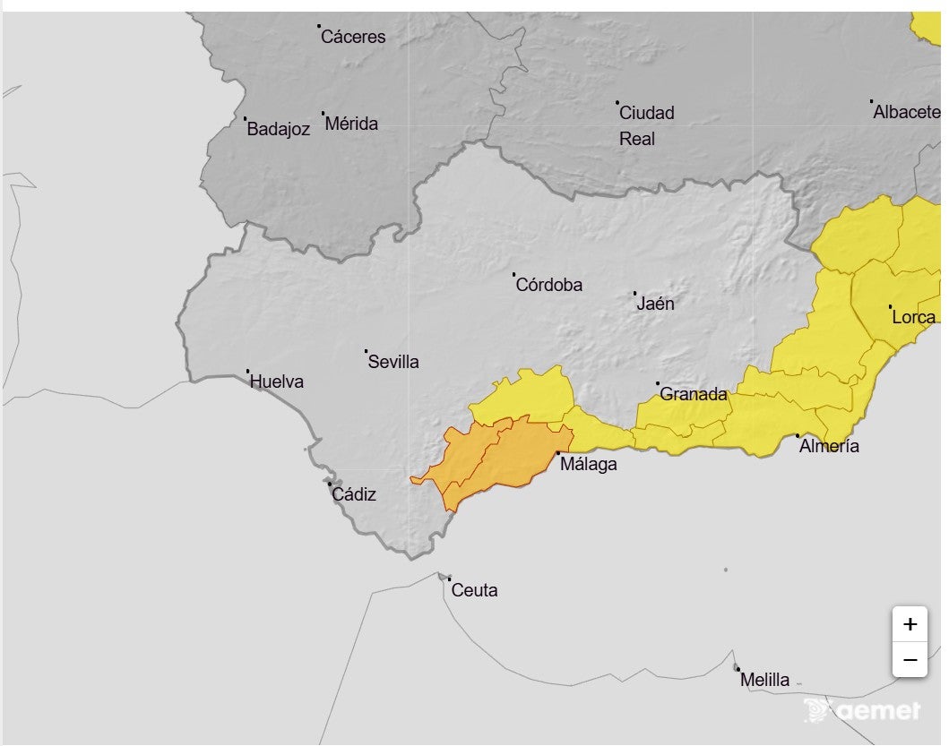 La Aemet activa el aviso naranja y amarillo para hoy sábado y mañana domingo en estas zonas de la provincia malagueña. Estas precipitaciones pueden venir acompañadas de tormentas.