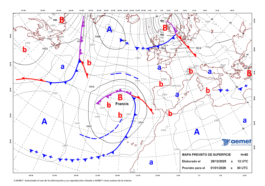 El jueves, 1 de enero, afectará con lluvias localmente fuertes en Canarias. El viernes día 2 a última hora, afectará a la zona más occidental de Andalucía. Durante el fin de semana llegarán las lluvias a la mayor parte de Andalucía; toda la provincia de Málaga también se verá afectada por Francis, que se situará en el golfo de Cádiz.