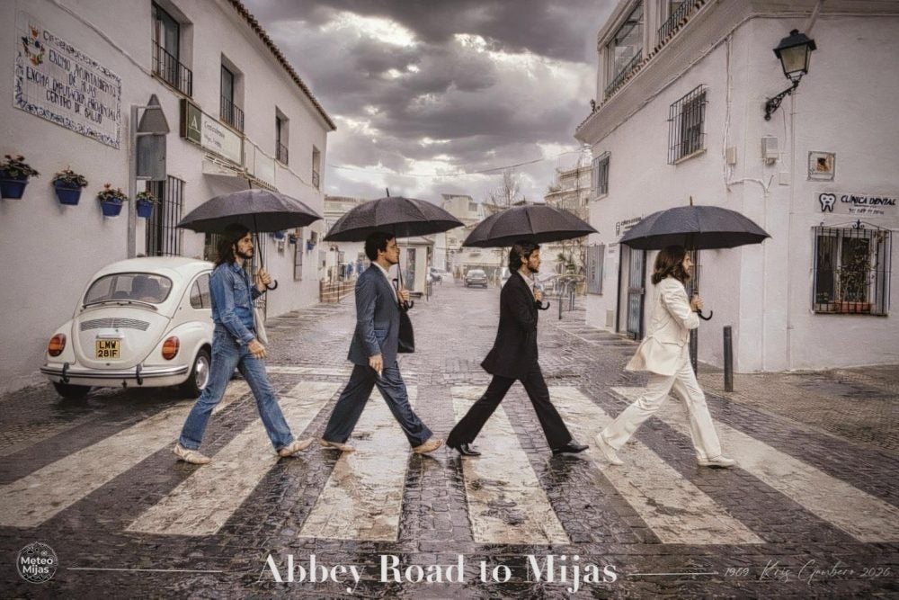 Bueno…me despido comentando la foto de hoy, ya os dije que hoy vendrían gente bastante ilustre de Liverpool, Inglaterra, aquí a Mijas. Pues aquí están… son estos 4 fenómenos, sus nombre, John, Ringo, Paul y George, ¿los habéis reconocido?, han venido directamente de Abbey Road donde en 1969 grabaron ese famoso álbum…..a darse un paseíto por Mijas, sin olvidarse el paraguas…como buenos ingleses que son.