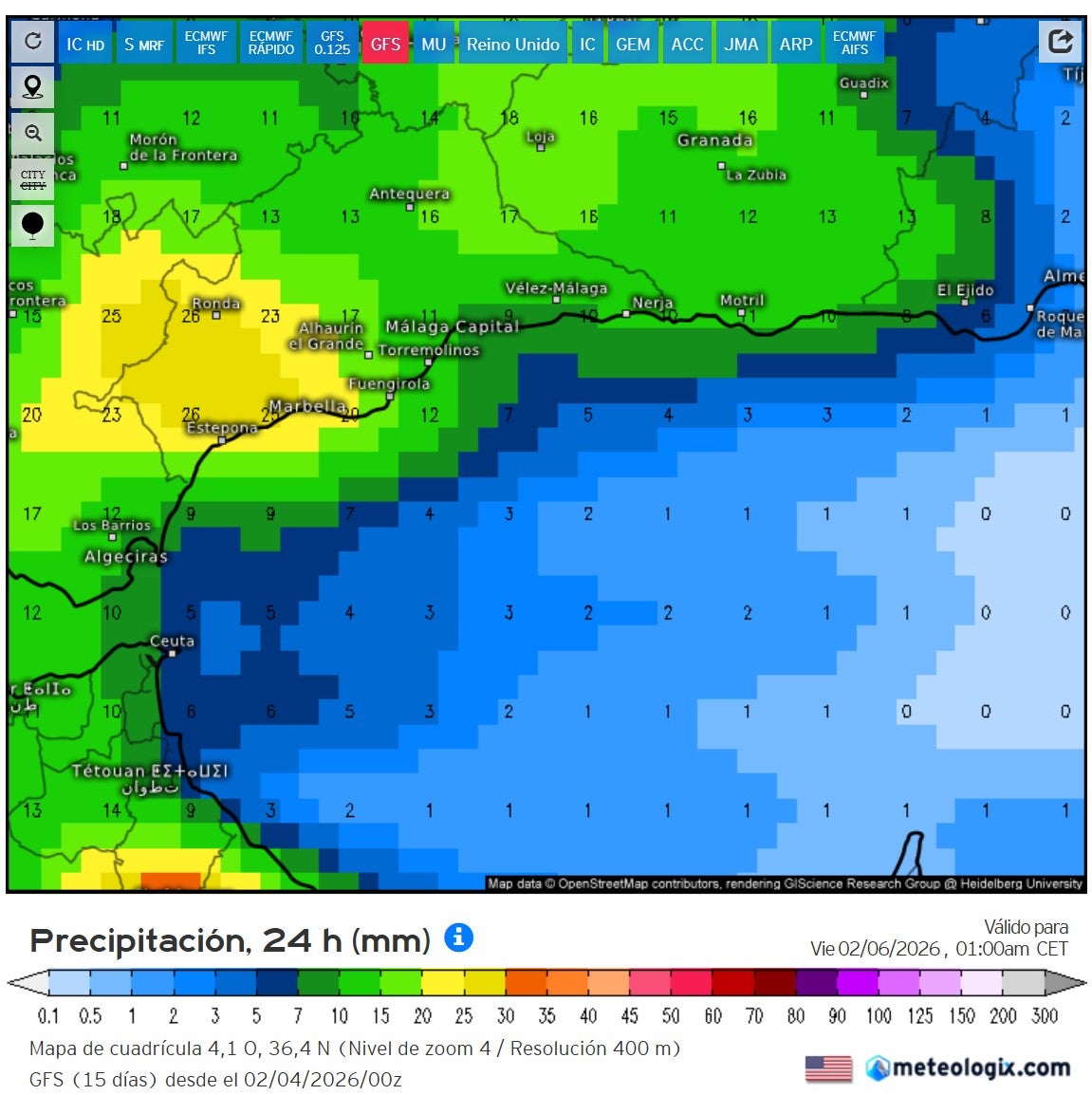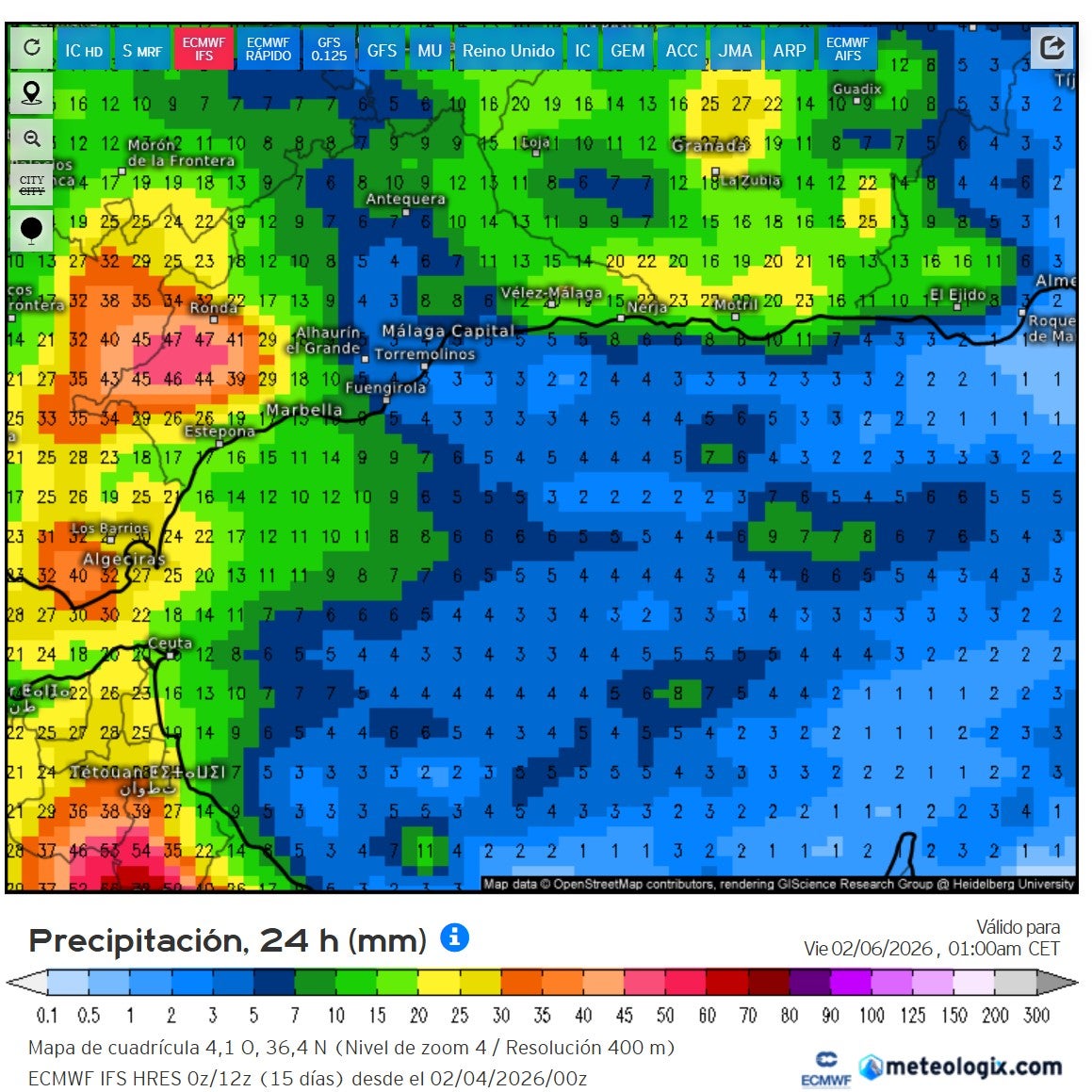Mañana jueves estamos en aviso amarillo por lluvias en Sol, Guadalhorce, y comarca de Ronda por precipitaciones en 12 horas de 40 mm. Será la zona más occidental la que reciba más litros. En Málaga capital, el efecto foehn hará que llueva menos.