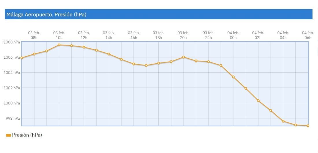 Buenos días, amigos de la meteo. Desde ayer por la noche nos está afectando el río atmosférico y la borrasca Leonardo. Os pongo el gráfico de presión del aeropuerto de Málaga; si os duele la cabeza, es por esto. Presión 997 hPa